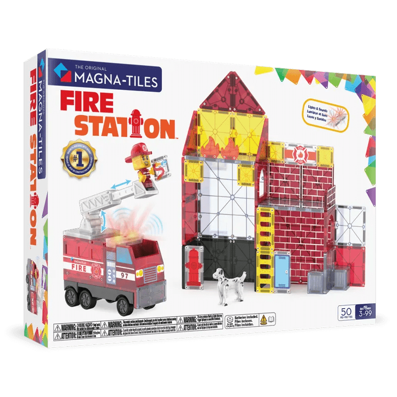 • Το Fire Station 50-Piece Set της MAGNA-TILES μεταμορφώνει το παιχνίδι ρόλων σε μια καθηλωτική εμπειρία πυρόσβεσης! Με φως και ήχο, ένα πυροσβεστικό όχημα με τηλεσκοπική σκάλαφιγούρα πυροσβέστησκύλο Δαλματίας και μαγνητικά πλακίδια, τα παιδιά δημιουργούν τον δικό τους πυροσβεστικό σταθμό και σενάρια διάσωσης, καλλιεργώντας τη φαντασία, τη δημιουργικότητα και τη λογική σκέψη.