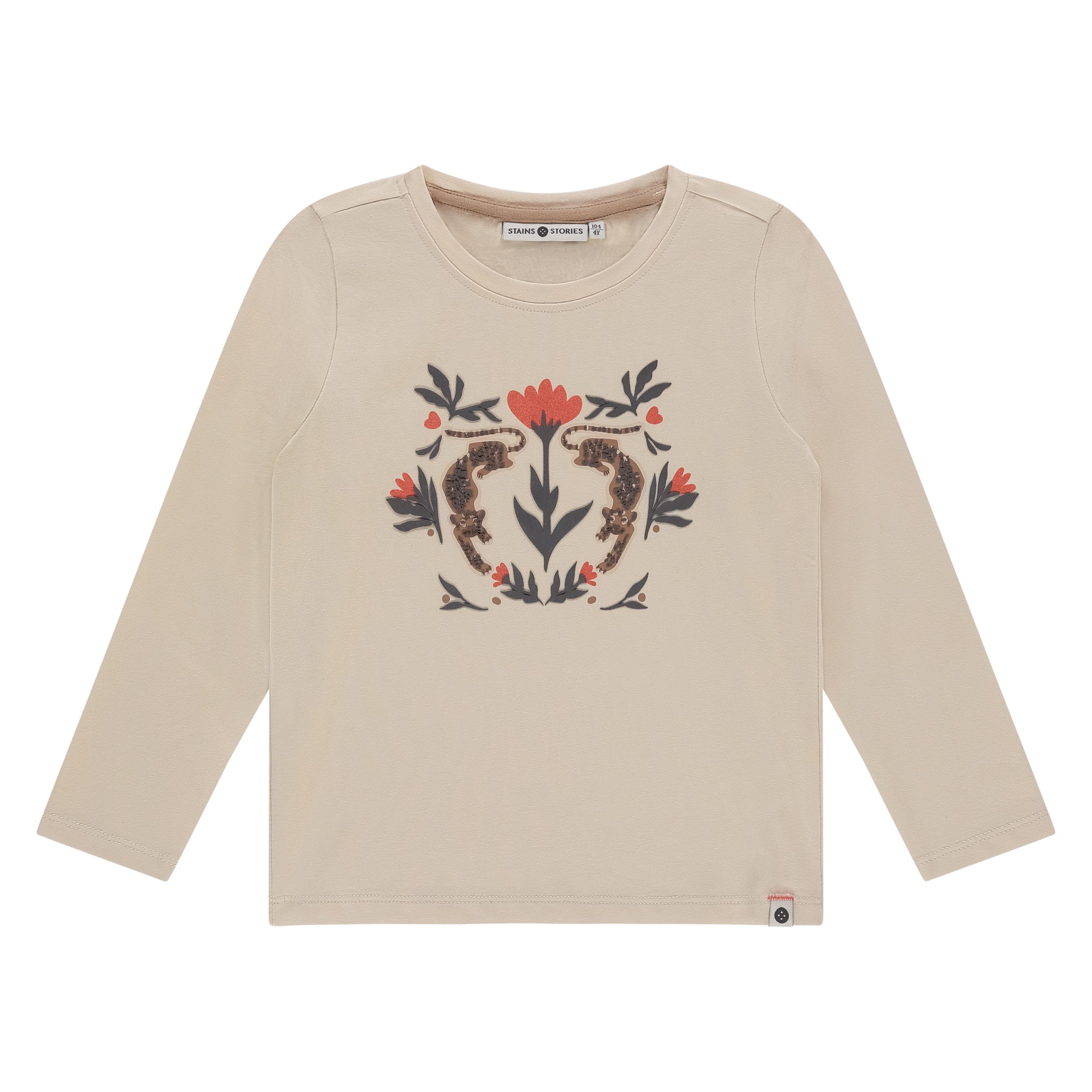 Μπλούζα λεπτή βαμβακερή σε εκρού χρώμα, με τύπωμα “τιγράκια” & κολάν καμπάνα σε μπεζ χρώμα βάση και animal print σχέδιο.