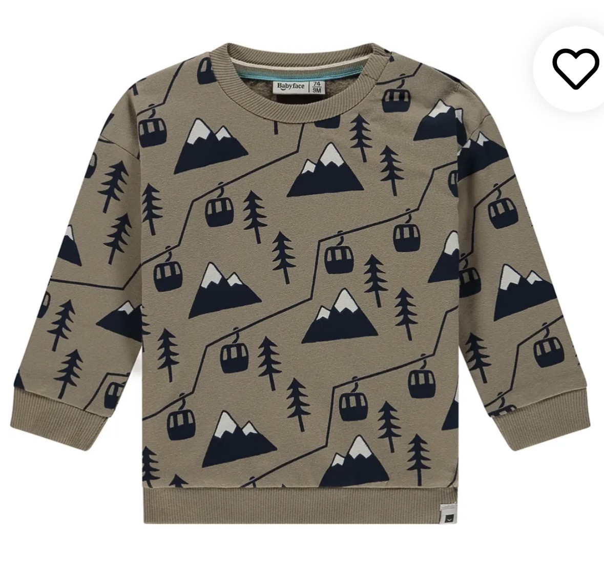 Βρεφικό σετ που αποτελείται από φούτερ σε σκούρο μπεζ χρώμα με all over print “βουναλάκια” και παντελόνι φόρμας σε μπλε χρώμα με λάστιχο στην μέση και στο κάτω μέρος.